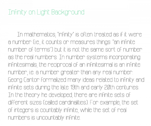Infinity è un carattere libero nato dalla combinazione di linee e curve con angolo rotondo e cappuccio. Il nome deriva dalle linee guida usate per la creazione, simili al numero 8 che rappresenta in molte culture l’infinito.