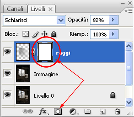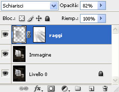 5) Ora settate il metodo di fusione del livello “raggi” in Schiarisci e impostate l’opacità a circa l’80%.