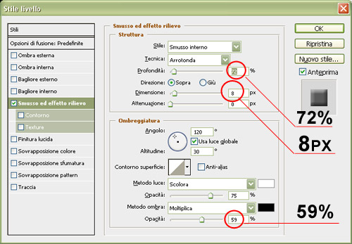 4) Diamo un pò di profondità alla nostra scritta, fate doppio click sul livello “Latte” e impostate gli stili di livello come nell’immagine seguente: