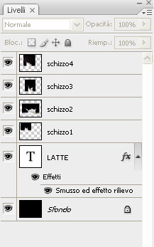 3) Una volta scritta la parola non vi resta che duplicare il testo, nascondere il livello di testo originale e rasterizzare la copia. Rinominate il livello rasterizzato in “Latte”