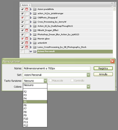 3) Selezionate il vostro nuovo Set di azioni e premete il tasto “Crea nuova azione“, digitate un nome che identifichi questa azione, nel mio caso voglio che le immagini vengano ridimensionate a 700 px di larghezza, chiamo quindi l’azione “Ridimensionamenti a 700px