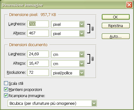 5) Qundi: trascinate un’immagine in Photoshop, cliccate sul tasto di registrazione della vostra azione (di fianco al tasto stop nella palette azioni ) e andate in Immagine–> Dimensione Immagine ed impostare come valore di larghezza 700px e premete ok.