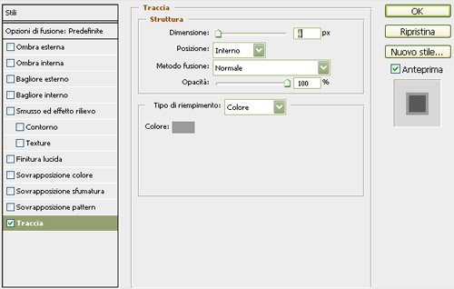 Ora fate doppio click sul nuovo livello per aprire la palette degli stili di livello, impostate come nella immagine seguente la traccia: