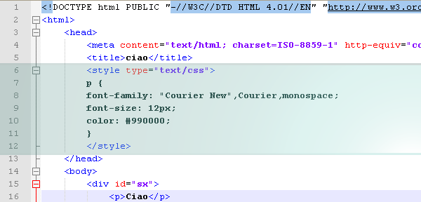Fatta questa premessa vediamo come muoversi nella pratica. Le istruzioni del foglio di stile vanno collocate all’interno del blocco <head> e sono a loro volta contenute all’interno di un blocco <style>. Ogni regola del foglio di stile si apre con l’elemento di HTML a cui la regola è riferita seguito dai parametri che ne definiscono le caratteristiche racchiusi tra parentesi graffe.