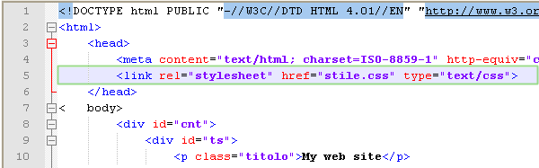 <link rel=”stylesheet” href=”stile.css” type=”text/css”>