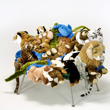 Oggetti che poi diventano pezzi d’arredamento e di uso quotidiano come lampade, mobili, sedie e poltrone, come la Sedia Banquete del 2002, un intreccio di peluche, o la Sedia Multidao, un intreccio di bellissime bambole di pezza.