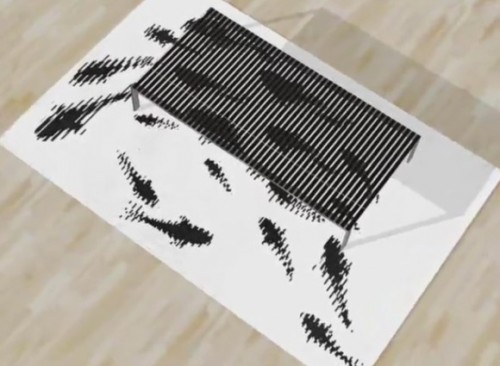 Si chiama (il gioco di parole lo identifica bene – Carp in inglese significa appunto “Carpa”) “Carp-pet” e guardando attraverso il tavolino a stecche si possono osservare i pesci stampati mentre si ‘animano’. Il tutto accade grazie al pattern moiré utilizzato per il disegno: la sovrapposizione delle linee genera l’effetto.