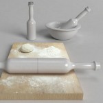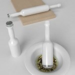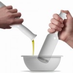L’oggetto di design è diviso in due parti ben distinte, una è una bottiglietta per l’olio, mentre l’altra parte è un pestello adatto alla macinazione/miscelazione degli ingredienti, che una volta unito all’altra metà serve per stendere la pasta come un tradizionale mattarello.