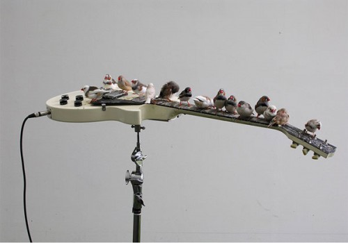 Ma se ci fosse un premio per l’idea più originale andrebbe sicuramente all’artista francese Céleste Boursier-Mougenot e alla sua installazione sonora alla London Barbican Art Gallery: chitarre e amplificatori inseriti in un ambiente artificiale emettono suoni e musica, sensibili al battito d’ali, al becco o alle zampe dei piccoli uccelli di passaggio.