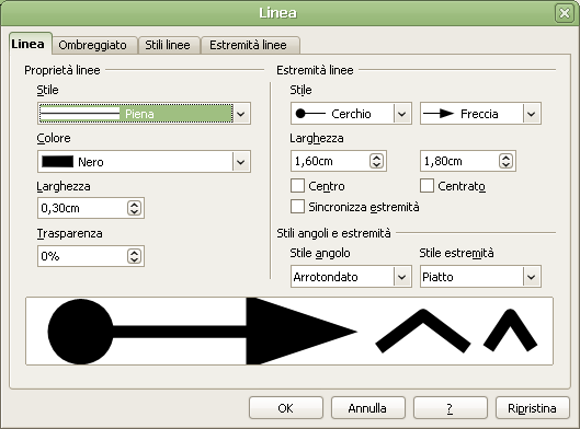 Ad esempio nel tab “Linea” possiamo definire tipologia, colore, spessore e trasparenza delle linee. Nella stessa scheda il riquadro “Estremità linee” permette di scegliere l’aspetto che avranno i punti terminali della linea. Potremo in questo modo disegnare frecce di varie forme ma anche cerchi, quadrati e rombi. Il tab “Ombreggiato” può essere invece utilizzato per dare tridimensionalità alla linea applicando un ombra.