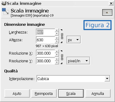 Oltre ai due casi esaminati, esiste anche la possibilità che il soggetto da ritagliare sia troppo grande per il riquadro da 400 pixel. In questo caso si deve preventivamente ridurre le dimensioni della foto originale andando nel menù “Immagine > Scala immagine” ed inserendo quindi in “Larghezza” ed “Altezza” valori opportuni (figura 2).