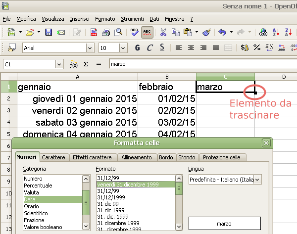 Apriamo quindi un nuovo foglio di calcolo di OpenOffice Calc ed iniziamo i lavori per creare il nostro “calendario 2015 da stampare”. Utilizziamo la prima riga per inserire i nomi dei 12 mesi. Ora portiamoci nella cella A2 ed inseriamo la data del primo gennaio 2015 nel formato 01/01/15. Selezioniamo ora con il mouse la cella A2 e trasciniamo il piccolo quadrato nero presente nell’angolo inferiore destro (v. immagine) giù di 31 caselle (tante quanti sono i giorni di gennaio). OpenOffice Calc completerà automaticamente tutte le caselle inserendo le date mancanti.