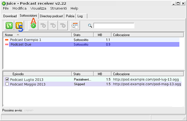 Avviato il programma per la prima volta andiamo in “Tools > Language” per tradurre l’interfaccia in Italiano. Riavviato il programma portiamoci sulla scheda “Sottoscrizioni” e clicchiamo poi sul pulsante “Aggiungi feed” (v. lettera A nell’immagine); copiamo l’indirizzo del podcast e clicchiamo su “Salva”. Juice analizzerà il feed e mostrerà nella parte inferiore della finestra i podcast disponibili; Spuntiamo infine gli ‘episodi’ che desideriamo scaricare, quindi premiamo il pulsante “Catch up – Scarica solo l’ultima sottoscrizione” (S). Troveremo l’elenco dei file scaricati nella scheda “Download”