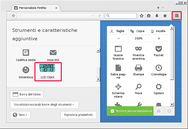 Ora nell’interfaccia di personalizzazione di Firefox individuiamo l’icona di LCD Clock e trasciniamola in una delle barre degli strumenti. Clicchiamo quindi su “Termina personalizzazione”. L’orologio di LCD Clock sarà ora visibile nell’interfaccia del browser e mostrerà l’orario di sistema.
