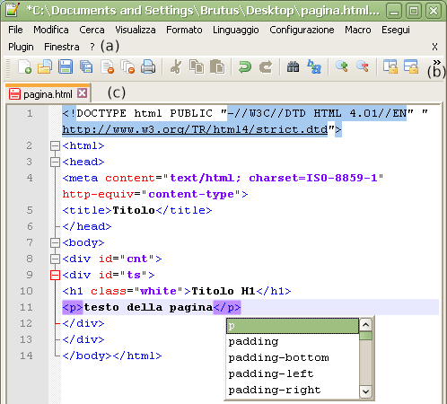 Notepad++ si presenta con una interfaccia molto pulita composta da una articolata barra dei menù (elemento ‘a’ dell’immagine), da una barra degli strumenti (b) che ripropone le funzione di usi più comune e da una barra delle schede (c) in cui vengono aperti i documenti su cui si lavora. Vediamo quindi brevemente come gestire un file HTML con Notepad++. Attraverso il menù “File > Apri” possiamo caricare un file HTML in Notepad++ che in questo caso riconoscerà automaticamente la struttura del documento ne evidenzierà la sintassi.