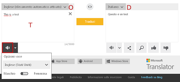 Raggiungiamo anzitutto la pagina di Bing Traduttore; qui utilizziamo la casella per la scelta della lingua di origine (indicata con O nell’immagine) e delle lingua di destinazione (D) per impostare la traduzione. Iniziamo quindi a digitare o a copiare il testo da tradurre nella casella a sinistra (T).