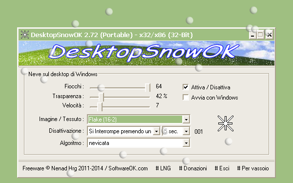 Nella finestra di DesktopSnowOK per prima cosa clicchiamo sul comando #LNG per scegliere la lingua italiana. A questo punto utilizziamo il cursore “Fiocchi” per variare il numero di ficchi di neve visualizzati sullo schermo (tra 5 e 64) per variare l’intensità della nevicata. Con “Trasparenza” possiamo invece configurare il livello di trasparenza dei fiocchi rispetto agli altri oggetti del desktop. “Velocità” regola invece la rapidità con cui i ficchi cadono sullo schermo.