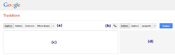 Nella barra (b) occorre invece scegliere la lingua di destinazione verso cui Google Traduttore tradurrà il testo inserito. Impostate le lingue di origine e di destinazione procediamo inserendo il testo nella casella (c); possiamo digitarlo direttamente da tastiera o più rapidamente effettuare un “copia ed incolla” dal documento originale. Nell’area (d) della pagina di Google Traduttore vedremo la traduzione in tempo quasi reale del testo digitato o incollato.