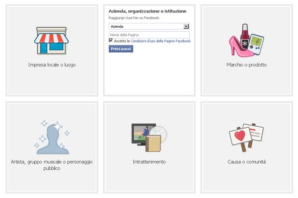 che rappresenta il punto di partenza per la creazione di una nuova pagina. Come possiamo notare Facebook individua sei diverse macro-categorie in cui collocare la nostra nuova pagina: Impresa locale o luogo, Azienda, organizzazione o istituzione, Marchio o prodotto, Artista, gruppo musicale o personaggio pubblico, Intrattenimento, Causa o comunità.