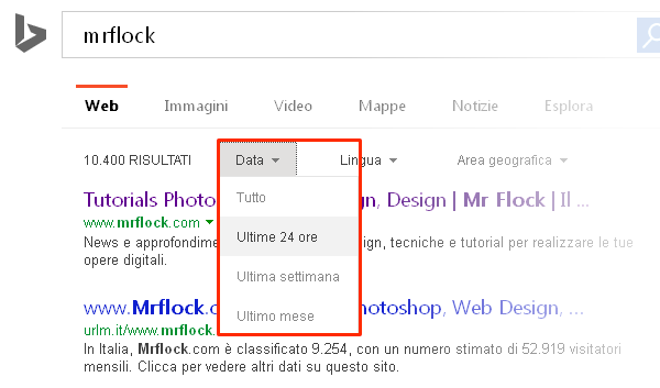 Bing permette anche di limitare con buona approssimazione la ricerca in base al paese che ospita una pagina web. Per cui se volessimo cercare solo pagine ospitate su server italiani non dovremmo far altro che cliccare sul menù “Area geografica” e scegliere “Solo da Italia”. Oltre che in maniera indipendente questo filtro può essere utilizzato assieme a quello linguistico descritto sopra.