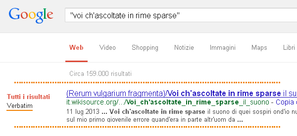 Un risultato analogo a quello generato con la funzione Verbatim si può ottenere racchiudendo la parola o la frase da cercare tra virgolette (“). Anche in questo caso l’uso delle virgolette suggerisce a Google che siamo interessati a quella specifica espressione riducendo drasticamente il numero dei risultati non pertinenti.