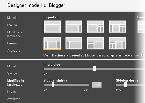 Molti template per blog o siti web fanno uso di una o più sidebar. Con questo termine si indicano colonne di servizio rispetto ai contenuti principali che possono contenere link, annotazioni, calendari, etc. La piattaforma Blogger offre uno strumento molto potente per stabilire numero, forma e posizione delle sidebar.