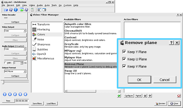 Il filtro “Remove Plane” di Avidemux permette di lavorare selettivamente sui colori di un video utilizzando la rappresentazione YUV. Senza entrare troppo nel tecnico, questo filtro può essere utilizzato per rimuovere una o più componenti dell’immagine con risultati finali a volte sorprendenti.