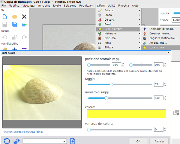 Il software opensource PhotoDemon dispone di una gran numero di effetti grafici che possono essere applicati alle fotografie per renderle più originali. “Luce solare” è tra gli effetti più suggestivi e permette di aggiungere una fonte di luce colorata all’immagine.