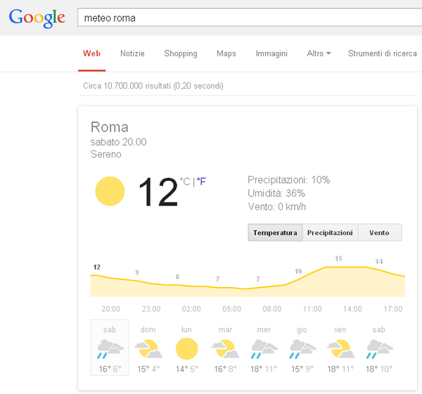Le previsioni meteorologiche sono storicamente tra gli argomenti più cercati dagli utenti in rete. Proprio in considerazione di questa tendenza Google ha predisposto un specifica funzione che consente di visualizzare rapidamente le previsioni meteo direttamente nella pagina dei risultati.
