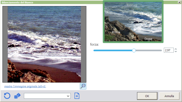 Come al solito il riquadro di sinistra mostra in anteprima l’effetto della regolazione mentre a destra il cursore “forza” regola l’intensità del bilanciamento. Il parametro ‘forza’ varia da un valore minimo di 0,01 ad un valore massimo di 5 e può essere regolato anche tramite la casella numerica a destra del cursore.