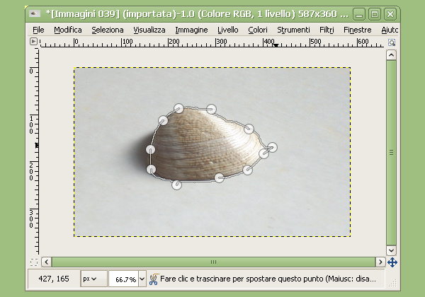 Seguiamo i contorni del bordo fino tornare al punto di partenza quindi premiamo il tasto Invio per trasformare il contorno in una selezione. Ora andiamo nel menù “Selezione > Inverti” per spostare la selezione dal soggetto allo sfondo. Anche in questo caso infine per eliminare lo sfondo andiamo nel menù “Modifia > Cancella”.