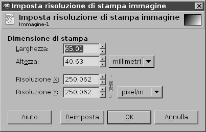 Le dimensioni di una immagine espresse in pixel non forniscono nessuna informazione sulle misure reali in fase stampa. Il pixel infatti individua semplicemente l’unità grafica minima con colore uniforme e la sua dimensione nel mondo fisico varia a seconda del display utilizzato (frazioni di millimetro su un monitor anche decine di centimetri in un maxischermo di uno stadio). Quando una fotografia o in generale una immagine deve essere stampata è ovviamente molto più comodo esprimere le sue dimensioni finali in millimetri. GIMP dispone di una funzione molto versatile per gestire questa conversione.