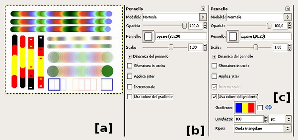 E’ interessante infine notare che il gradiente di colori in GIMP è utilizzato qualsiasi sia la forma scelta per Pennello, Matita o Aerografo [a], una soluzione che offre quindi la massima flessibilità d’uso.