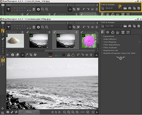 Se è la prima volta che l’immagine viene aperta in RawTherapee vedremo come profilo predefinito (Neutral) mentre se l’immagine è stata già modificata in passato troveremo attivo il profilo (Ultimo salvato) che coincide con le impostazioni adottate l’ultima volta che l’immagine è stata salvata dal programma.