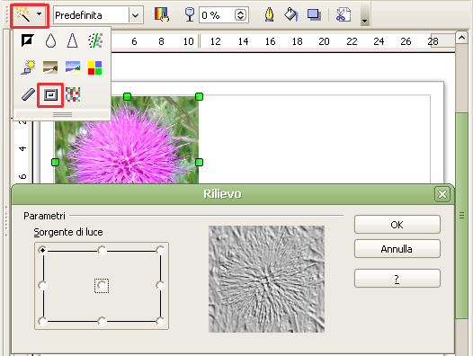 Per applicare l’effetto bassorilievo utilizziamo il pulsante “Filtri” e tra gli strumenti disponibili scegliamo quello denominato “Rilievo”. A questo filtro è associata una finestra di dialogo denominata proprio “Rilievo” che permette di stabilire l’orientamento della luce rispetto al disegno. Mantenendo la posizione centrale l’effetto bassorilievo sarà appenna accennato mentre sarà più marcato scegliendo una qualsiasi altra posizione per la sorgente della luce. Nella stessa finestra è possibile vedere in anteprima il risultato dell’effetto bassorilievo. Per applicare il filtro clicchiamo infine sul pulsante “Ok”.