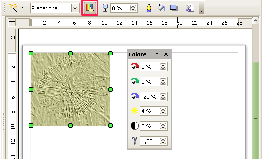 Applicato l’effetto bassorilievo è possibile eventualmente rafforzarne l’azione applicando nuovamente il filtro “Rilievo” di OpenOffice Draw. Possiamo invece intervenire sul colore del materiale di fondo utilizzando lo strumento “Colore” anch’esso evidenziato nell’immagine sopra. Grazie a questo strumento è possibile modificare rapidamente i tre colori primari, la luminosità ed il contrasto dell’immagine. Intervenendo su questi parametri è possibile ricreare gli effetti tipici ad esempio di una lastra metallica o di una pietra opaca.