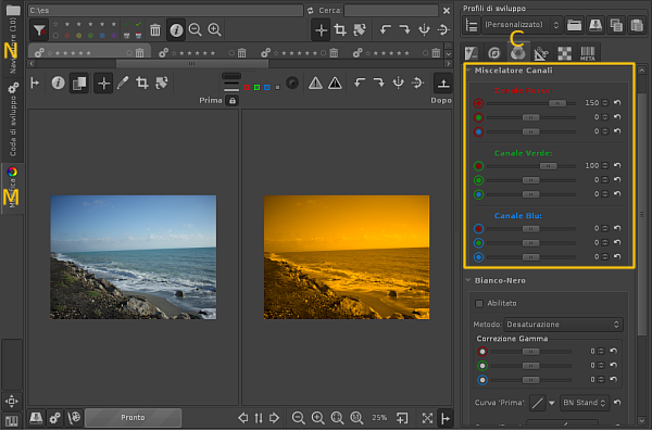 Avviato RawTherapee utilizziamo la scheda “Navigatore” (indicata con N nell’immagine) per individuare la foto da modificare e con un doppio click portiamola nel tab “Modifica” (M). Nella sidebar di destra attiviamo la scheda Colore (C) ed espandiamo la sezione “Miscelatore canale”.