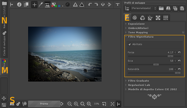 Intervenendo sul parametro “Rotondità” definiamo infine la forma della vignettatura (0=rettangolo, 50=ellisse, 100=cerchio). Stabilita la combinazione desiderata possiamo come al solito salvare le modifiche con il pulsante “Salva l’immagine corrente” (S).