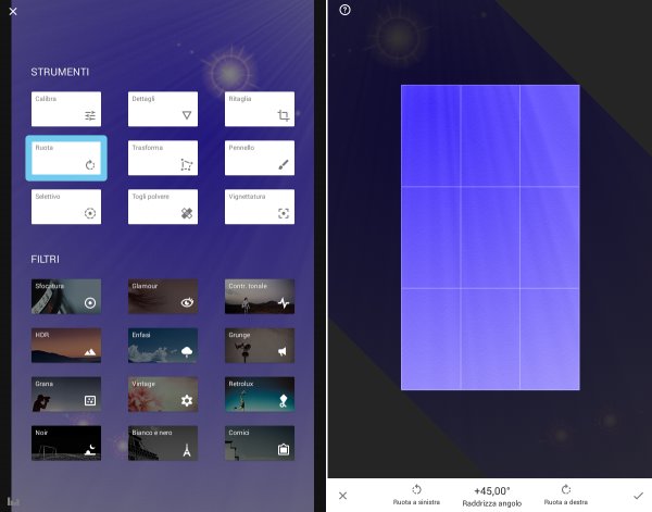 A volte una foto va ruotata secondo un angolo particolare come accade ad esempio quando per un errore nella fase di ripresa l’orizzonte non è ‘orizzontale’ (il classico ‘mare in discesa’). Snapseed per Android gestisce anche questa esigenza in maniera molto intuitiva. All’interno dello strumento “Ritaglia” l’applicazione visualizza una griglia sovrapposta all’immagine. Per ruotare la foto è sufficiente far scorrere il dito lungo una delle linee che compongono la griglia stessa.