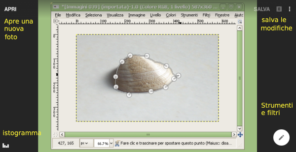 L’immagine verrà aperta nell’editor di Snapseed che presente quattro comandi principali distribuiti ai quattro angoli dello schermo. In alto a sinistra il comando “Apri” consente in qualsiasi momento di aprire una nuova immagine. In alto a destra invece il comando “Salva” permette di salvare l’immagine modificata; alla sua destra un numero indica quante modifiche sono state apportate e tre puntini verticali celano alcune funzioni secondarie. Nell’angolo in basso a sinistra l’icona di un grafico permette di visualizzare l’istogramma dell’immagine. In basso a destra infine il pulsante con l’icona di una matita da accesso agli strumenti ed ai filtri per modificare l’immagine.