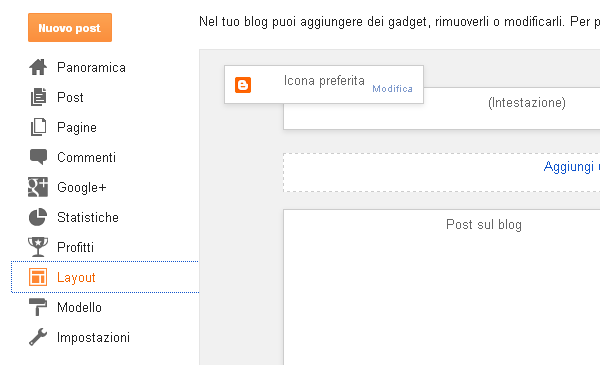 Effettuato il login in Blogger dalla finestra “I miei blog” clicchiamo sul nome del blog su cui vogliamo intervenire in modo da caricare la corrispondete bacheca. Utilizziamo la colonna di sinistra per selezionare la voce “Layout” che da accesso alla struttura base del template. Qui individuiamo il riquadro “Icona predefinita” che, di base, mostrerà l’icona di Blogger. Nello stesso riquadro procediamo cliccando sul collegamento “Modifica”.