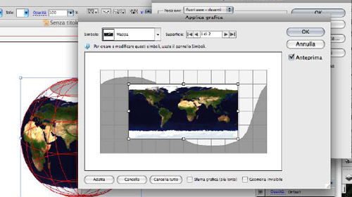 Si aprirà nuovamente la finestre di prima, in questo caso però selezioniamo “Applica Grafica“, nella finestrella con scritto simbolo selezioniamo la mappa, verrà automaticamente importata all’interno dello schema, a questo punto se l’immagine non è perfettamente rettangolare potete aggiustarvela manualmente all’interno dell’area, altrimenti utiliiziamo la voce “adatta” in basso a sinistra nella finestra. In entrambi i casi spuntando la voce “Anteprima” sulla sfera vedrete l’area d’azione della mappa.