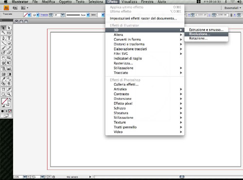 Andiamo su Effetto –> 3D –> Rivoluzione ed usiamo sempre le impostazioni standard, se la forma che viene a crearsi non vi convince più di tanto potete, utilizzando la frecciano bianca, sistemare la figura spostando i punti del tracciato precedentemente creato, io per esempio ho sistemato la lunghezza della base.