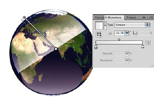 Con lo strumento sfumatura diamo alla mezzaluna una tonalità che parte da bianco ed arriva verso il centro della sfera a trasparente, fatto ciò diamogli una trasparenza al 70% come fatto precedentemente per la base della sfera.
