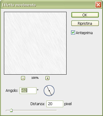 Ora, sempre con il livello “Pioggia” attivo andate in Filtro–>Sfocatura–> Effetto Movimento, impostate l’angolo di inclinatura della pioggia (dipende dalla fotografia e da come volete voi ) e impostate a 20px la distanza.