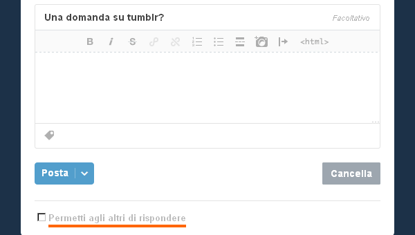 Andiamo nella nostra bacheca (dashboard) e clicchiamo sul pulsante per la creazione di un nuovo post di testo. Si aprirà l’usuale finestra di editing per la composizione di un nuovo post. Nella casella del titolo scriviamo la domanda che vogliamo porre senza dimenticare di porre il punto interrogativo alla fine del quesito. Proprio questo elemento attiva infatti la funzione delle risposte: vedremo comparire sotto l’area del post la casella “Permetti agli altri di rispondere” che se spuntata darà la possibilità agli altri utenti di rispondere al nostro quesito in maniera molto simile a come si farebbe con i normali commenti.