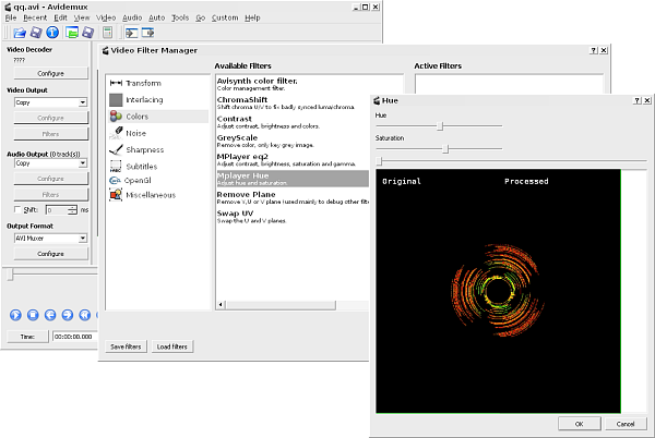 Avidemux dispone di uno speciale filtro denominato MPlayer Hue che permette di cambiare i colori di un video. Questo strumento può essere usato per apportare delle correzioni nei filmati con colori alterati. Ovviamente il filtro può anche essere utilizzato in chiave creativa per produrre particolari effetti colore.