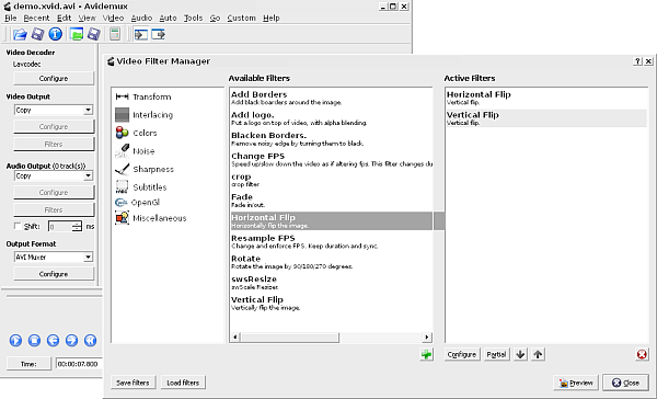In “Available Filters” è disponibile anche il filtro “Vertical Flip” che si comporta in maniera analoga a quanto descritto sopra specchiando però il video in verticale. Con questo filtro Avidemux andrà cioè ad invertire destra e sinistra nel filmato. Ovviamente “Horizontal Flip” e “Vertical Flip” possono essere utilizzati anche contemporaneamente.
