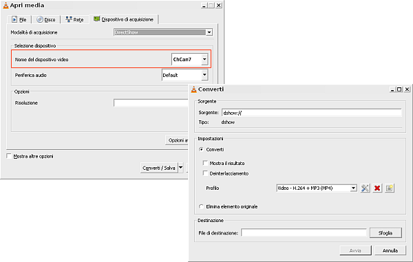 Dal menù “Media” di VLC scegliamo il comando “Converti / Salva” in modo da aprire la finestra “Apri media”. Al suo interno portiamoci sulla scheda “Dispositivo di acquisizione” ed utilizziamo la casella “Modalità di acquisizione” per definire come gestire lo stream video della webcam: in Windows solitamente si sceglierà “DirectShoW”, in Linux “Video for Linux”.