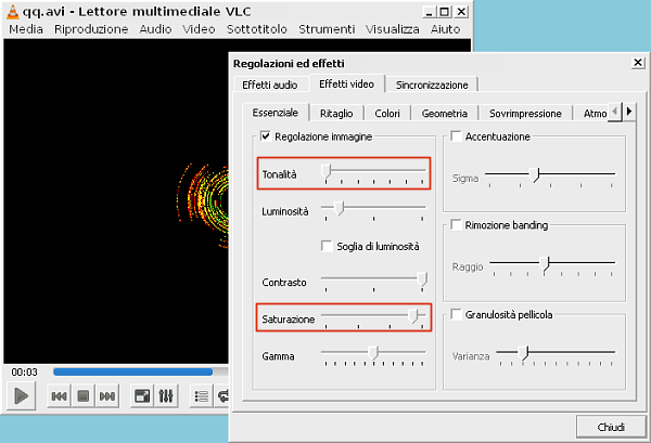 L’effetto dei due parametri si applica in tempo reale al filmato riprodotto nella finestra principale di VLC.